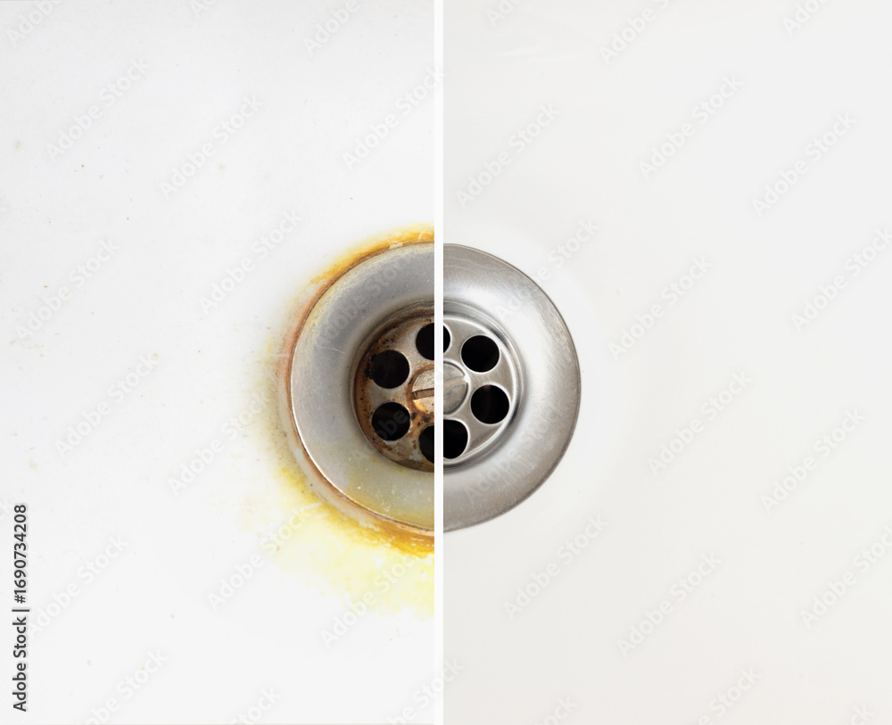 Compare before and after clean the Dirty sink, rusty stain on an old and dirty sink and a rusty metal drain in the bathroom