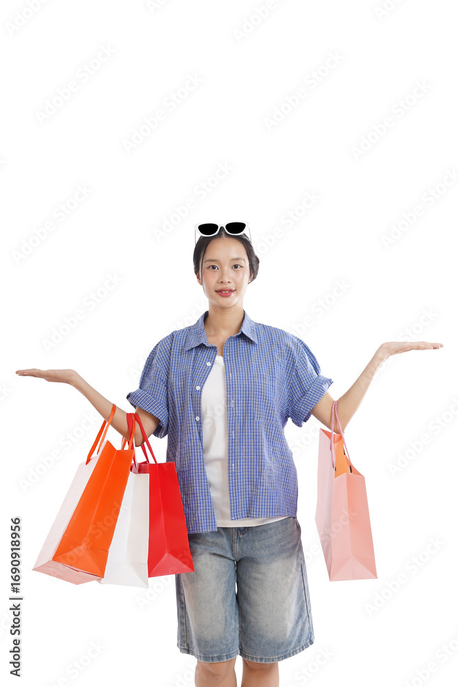 Shopaholic's Joy: A young woman, radiant with smiles, is showcased against a backdrop of pristine brightness, revels in the pure delight of shopping.