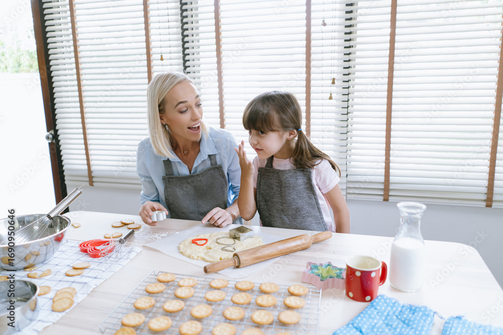Happy mother and little girl wearing aprons preparing homemade cookies. The kitchen scene shows joy, teamwork, and a warm family connection through cooking.