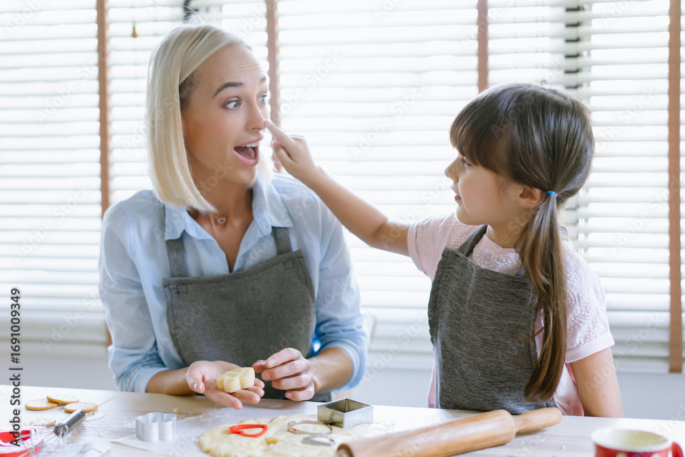 A loving mother and her daughter baking cookies together in the kitchen, laughing and sharing sweet playful family time at home with happiness, bonding, and cheerful moments.