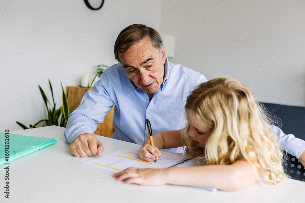 Young little cute girl doing homework with her grandfather at home. Old man helping her daughter with school tasks. Education and family concept.