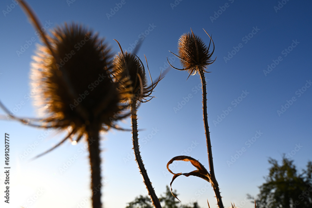 Spiny golden thistle or globe thistles with spines, a weed in the natural meadow, also known as Echinops plant, with blue sky in the early morning.
