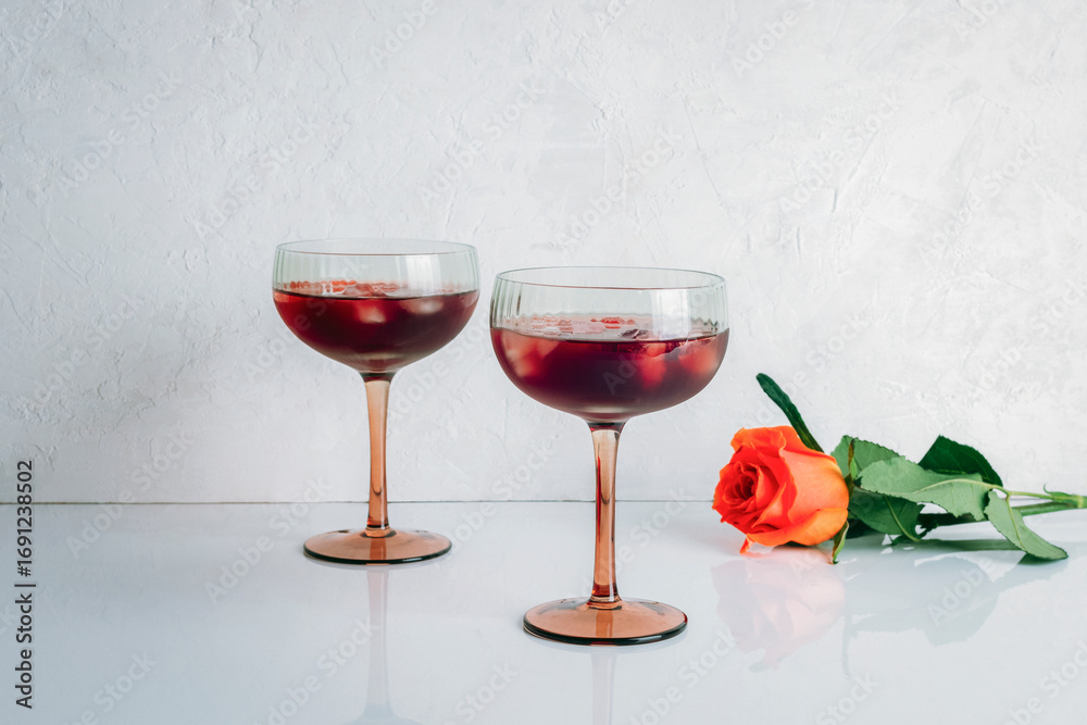 Two elegant glasses of red cocktail with ice cubes and orange rose on white background. Closeup