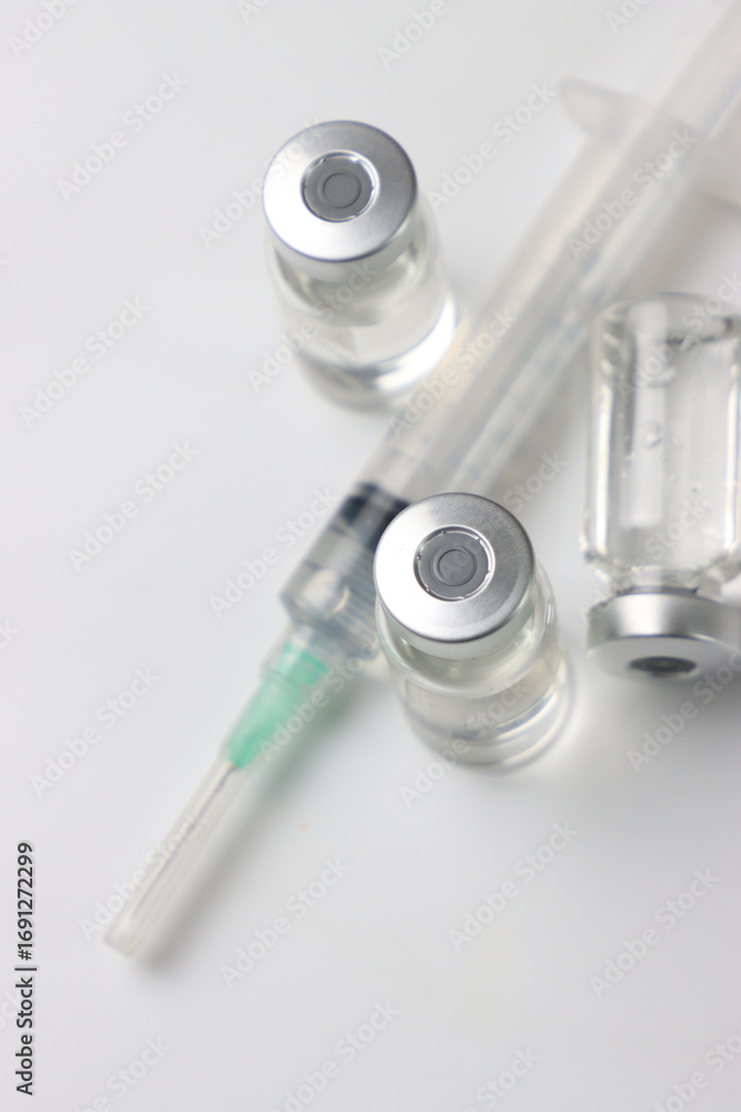 Vitamins pills and injectable in a white background