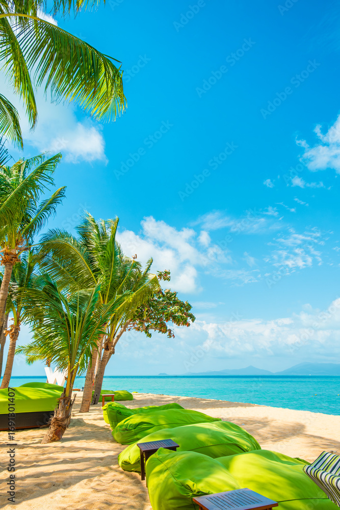 Tropical W beach on Koh Samui island with green bean bags, sun loungers, golden sand, turquoise sea and palm trees under bright blue sky, Thailand. Vertical orientation. Tropical paradise