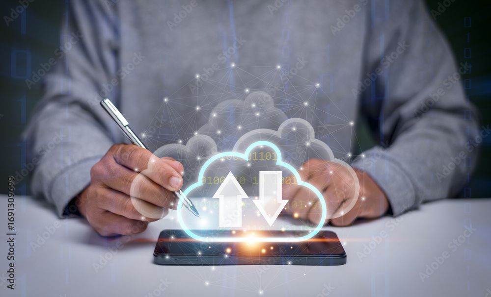 Cloud computing concept. Man using pen point to glowing clouds with upload and download icon above smartphone. Symbolizing online data storage, information sharing, internet technology and innovation.