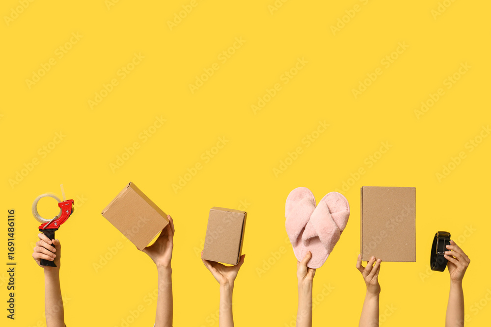 Female hands with wardrobe boxes, slippers, belt and adhesive tape on yellow background