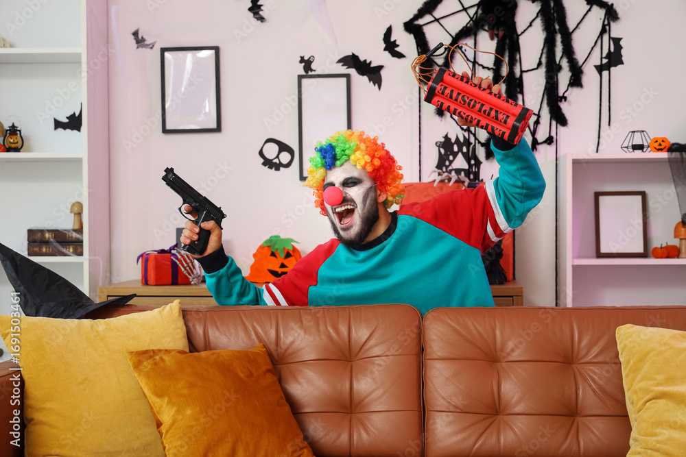 Young man dressed as crazy clown for Halloween with gun screaming while throwing dynamite in decorated living room