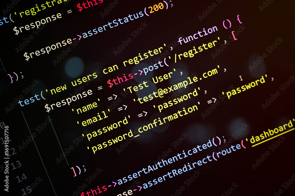 Close-up of PHP code testing new user registration with password confirmation and redirect to dashboard, representing backend programming, software testing, and secure authentication system.