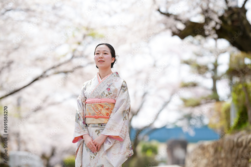 A woman in a kimono stands in front of a tree with pink blossoms. She is looking at the camera with a smile on her face. Concept of tranquility and beauty