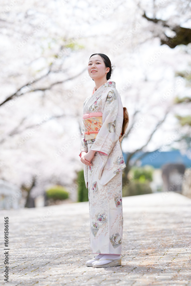 A woman in a kimono stands in front of cherry blossoms. She is smiling and she is enjoying the beautiful scenery