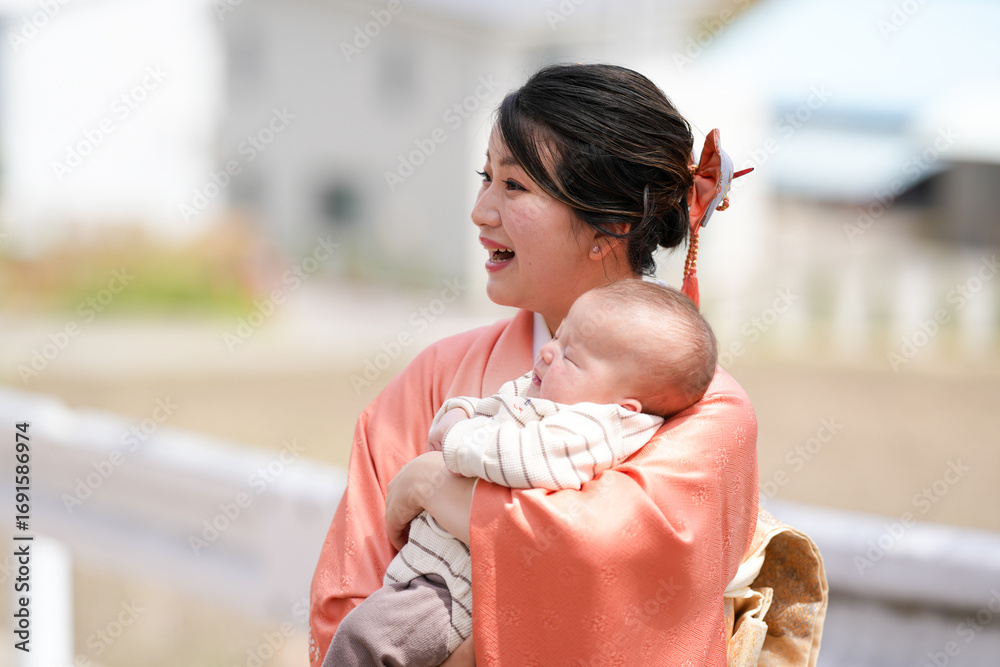 A woman is holding a baby in her arms. The baby is sleeping and the woman is smiling. The scene is peaceful and heartwarming