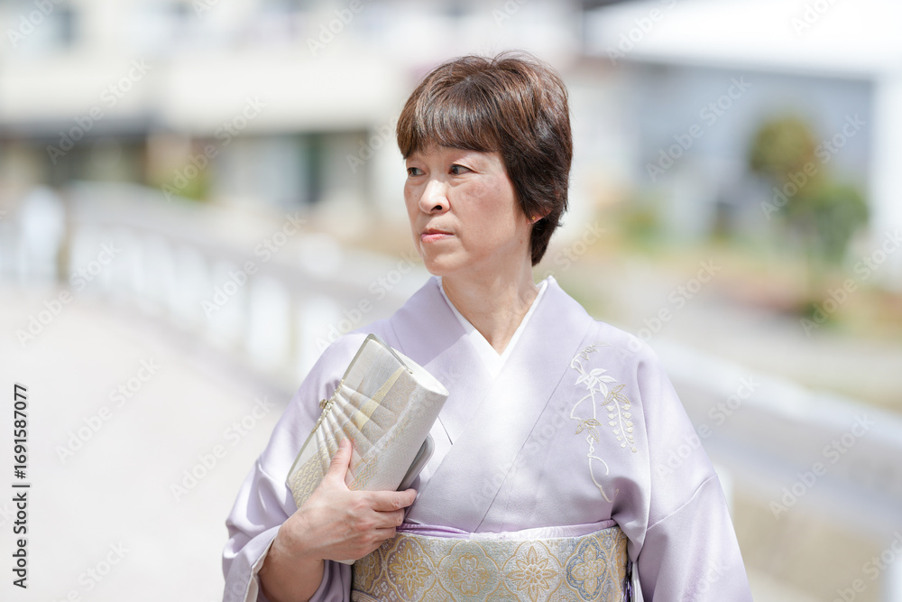 A woman in a purple kimono is holding a purse. Concept of elegance and sophistication, as the woman is dressed in traditional Japanese clothing. The purse adds a touch of modernity to her outfit