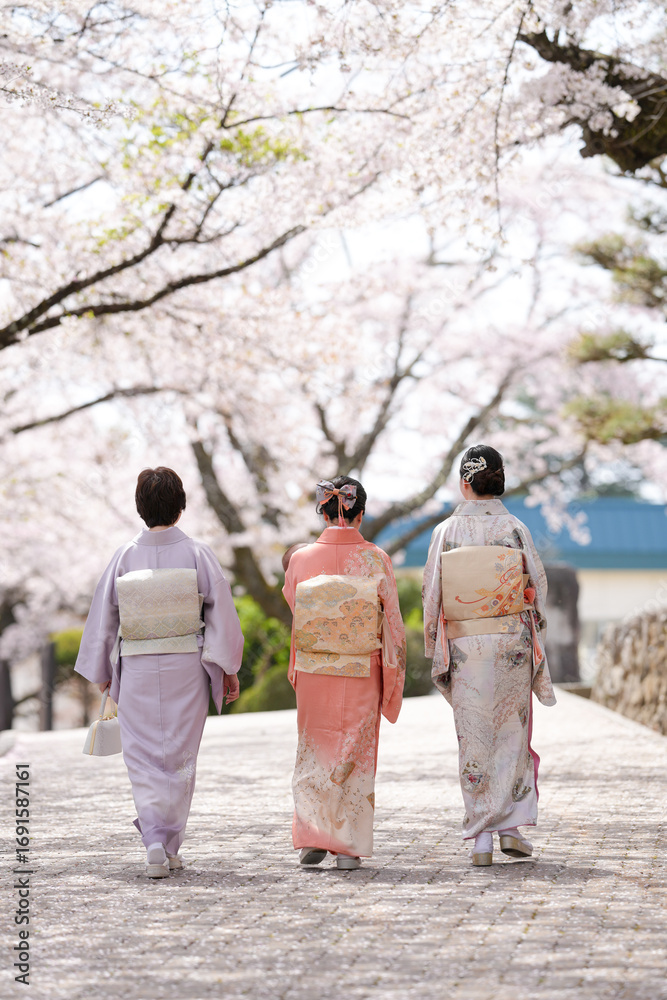 Three women in traditional Japanese clothing walk down a path. The women are wearing kimonos and appear to be enjoying the scenery