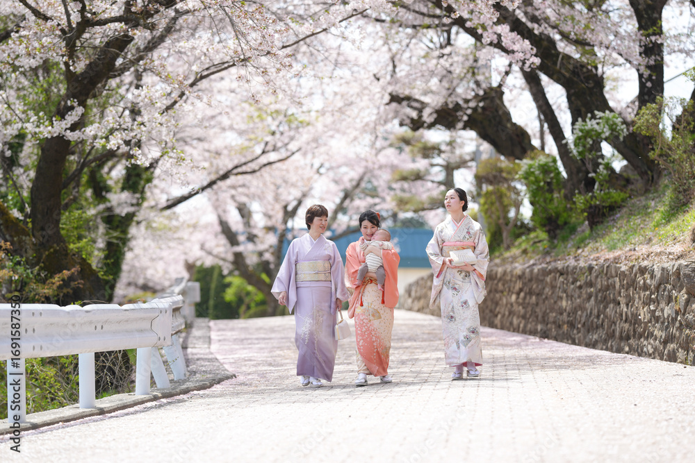 Three women in traditional Japanese clothing walk down a road lined with cherry blossoms. The scene is serene and peaceful, with the women enjoying the beauty of the flowers and the quiet surroundings