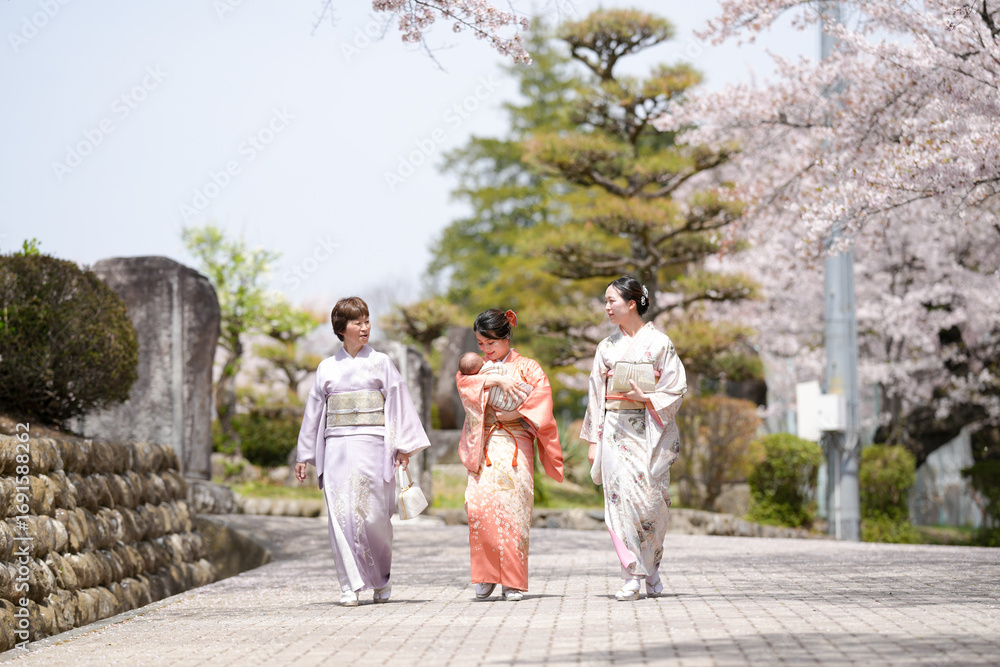 Three women in traditional Japanese clothing walk down a path. One of the women is holding a baby. The scene is peaceful and serene, with cherry blossoms in the background