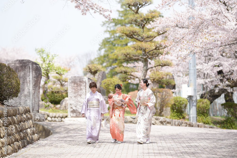Three women in traditional Japanese clothing walk down a path in a park. One of the women is holding a baby. The scene is peaceful and serene, with the women enjoying a leisurely stroll in the park