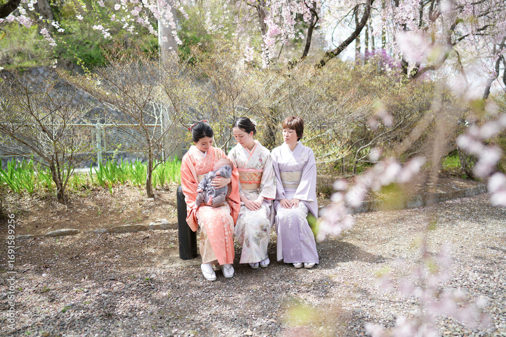 Three women in kimonos sit on a bench in a park. One of the women is holding a baby. The scene is peaceful and serene, with the women enjoying each other's company and the beauty of the park