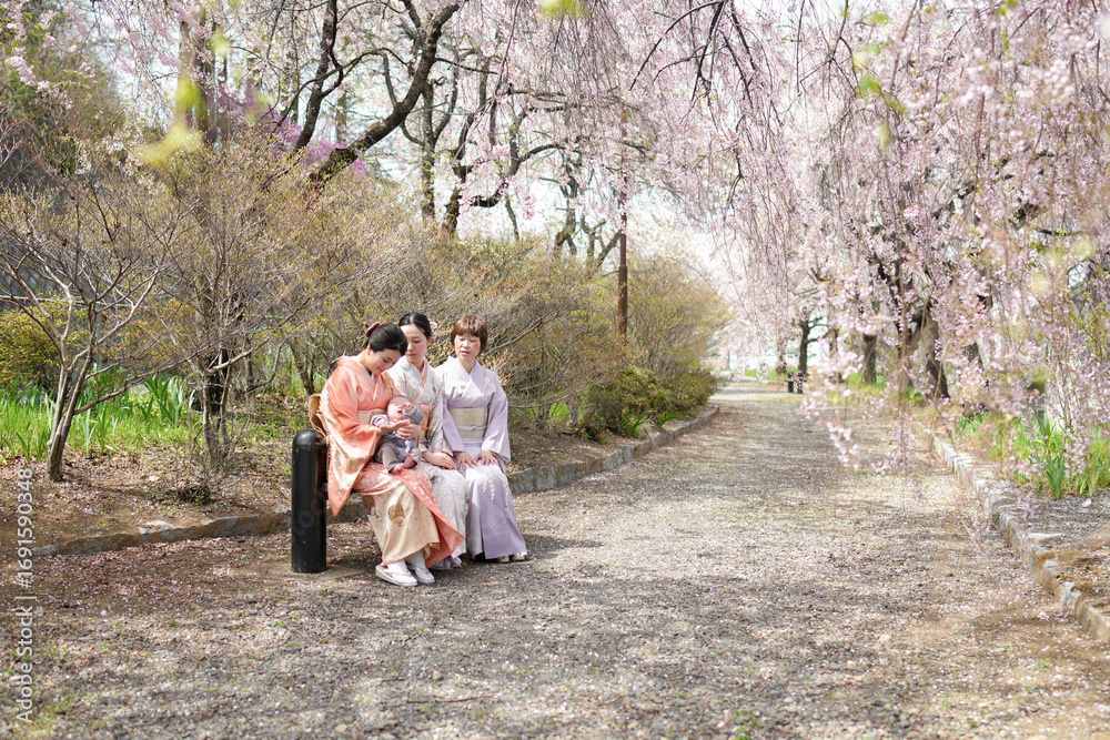 Three women sitting on a bench in a park, one of them holding a child. The park is filled with cherry blossoms, creating a serene and peaceful atmosphere