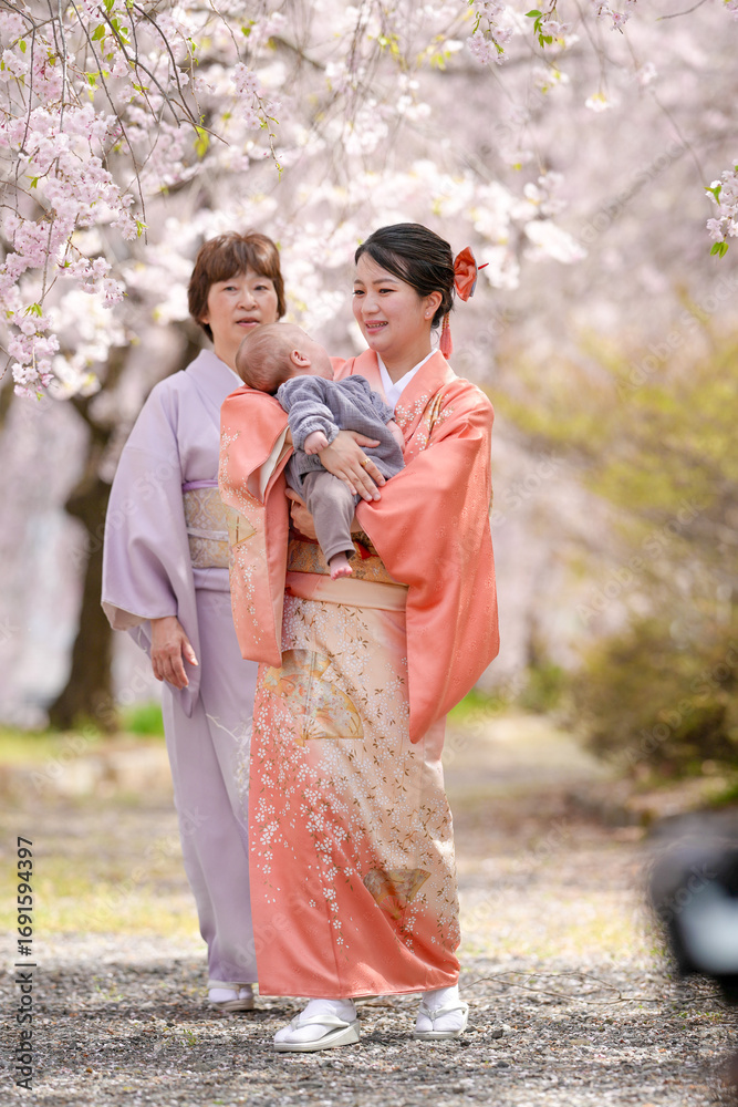 A woman in a kimono is holding a baby. The baby is wearing a white outfit. The scene is set in a park with cherry blossoms in the background