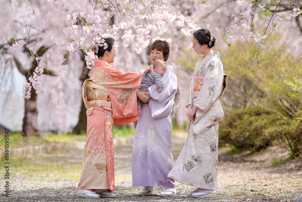 Three women in traditional Japanese clothing are standing in a park, one of them holding a baby. Concept of warmth and togetherness, as the women are likely friends or family members