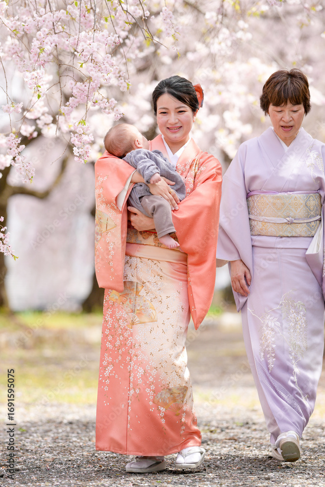 A woman is holding a baby while wearing a kimono. She is walking with two other women