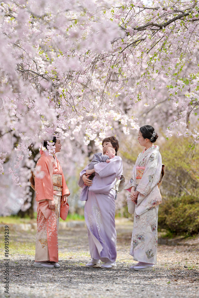 Three women in traditional Japanese clothing are standing under a tree with pink blossoms. One of the women is holding a baby. The scene is peaceful and serene