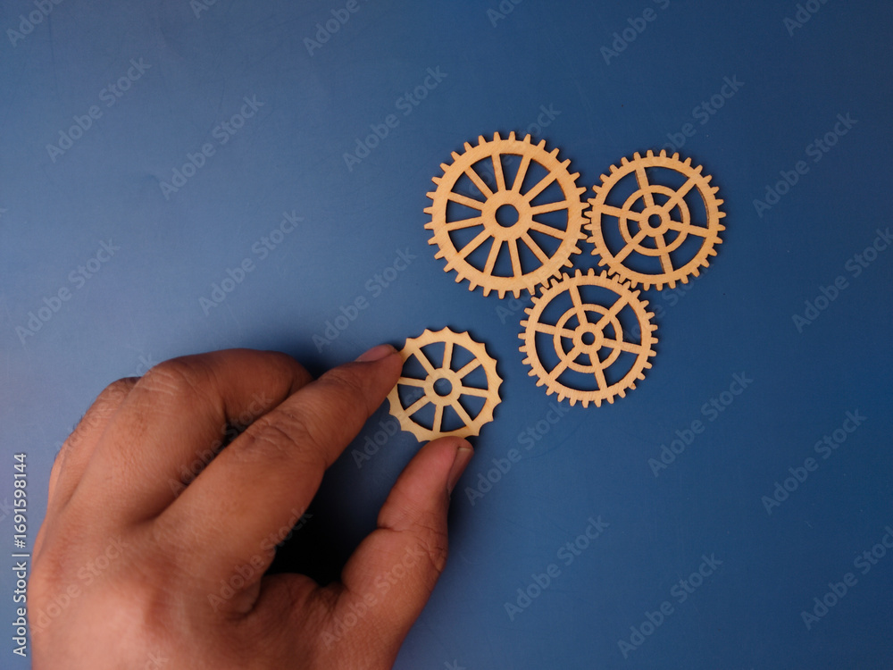 The image shows a hand holding a small wooden gear, with three other similar gears arranged on a blue background