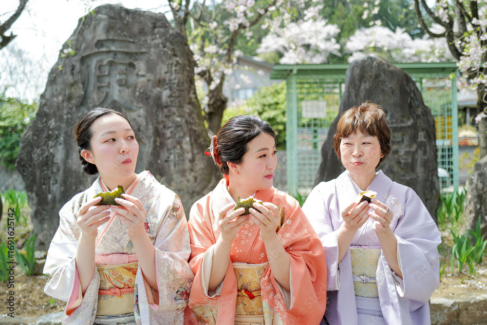 Three women in traditional Japanese clothing are sitting together and eating food. Scene is lighthearted and friendly, as the women are enjoying each other's company and sharing a meal