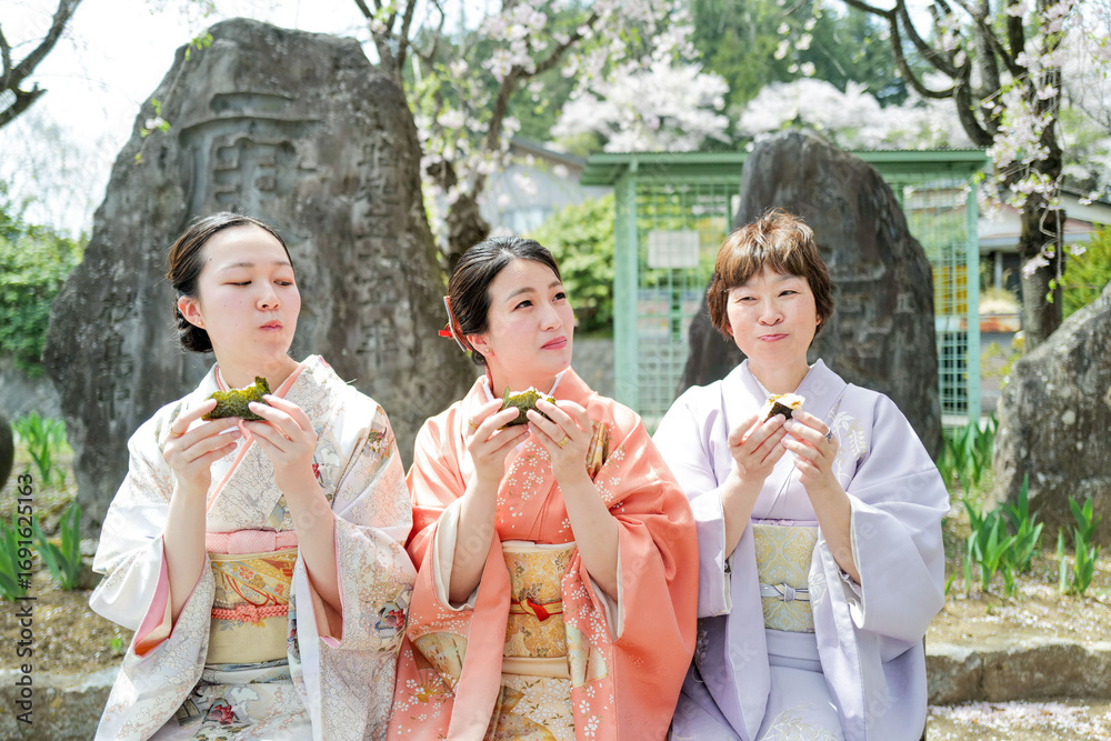Three women in traditional Japanese clothing are sitting together and eating food. Scene is lighthearted and friendly, as the women are enjoying each other's company and sharing a meal