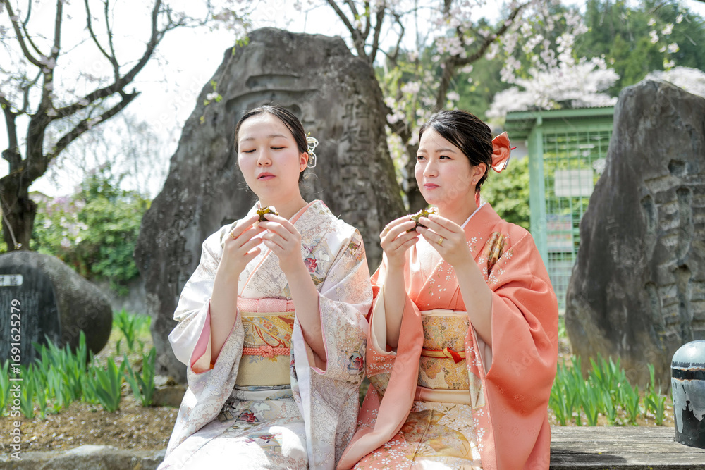 Two women in traditional Japanese clothing are sitting on a bench, eating food. Scene is peaceful and serene, as the women are enjoying a moment of relaxation and bonding over their meal