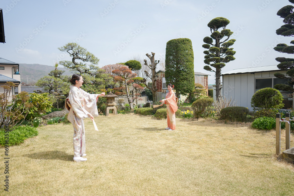 Two women in kimonos are standing in a grassy area, one of them holding a stick. The scene has a peaceful and serene atmosphere, with the women dressed in traditional Japanese clothing