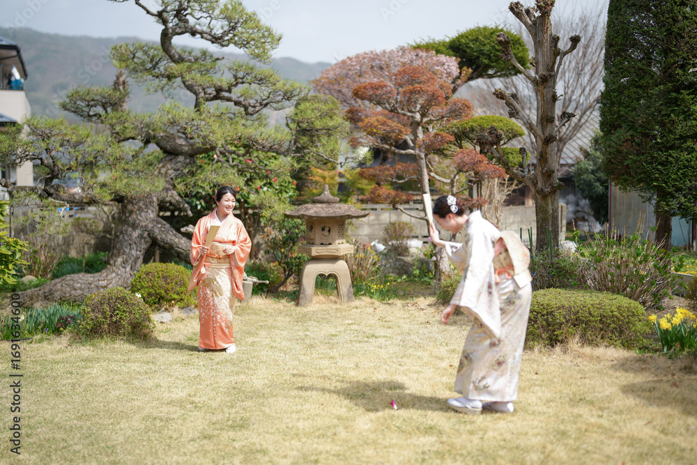 Two women in kimonos playing a game of badminton in a park. Scene is lighthearted and fun, as the women are enjoying themselves and engaging in a friendly competition