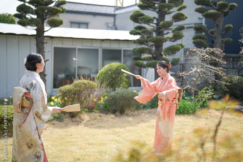 Two women in kimonos playing a game of badminton. Scene is lighthearted and fun