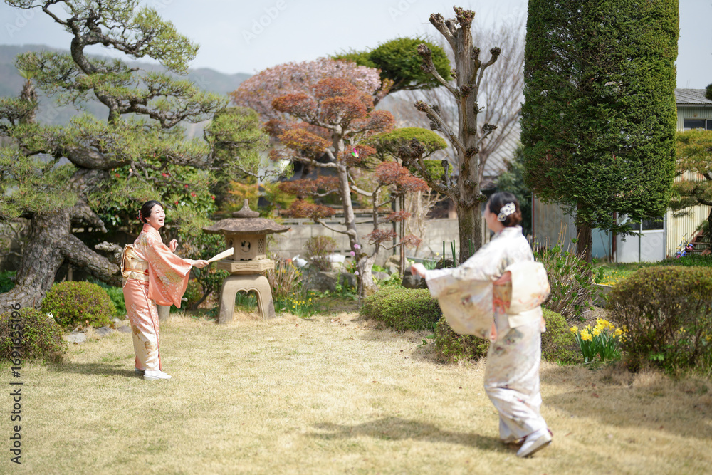 Two women in kimonos playing a game of badminton in a park. Scene is lighthearted and fun, as the women are enjoying themselves and engaging in a friendly competition