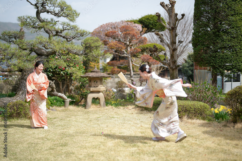 Two women in kimonos are playing a game of badminton in a park. One of the women is holding a fan, which she is using to block the ball from her opponent. The scene is lively and playful