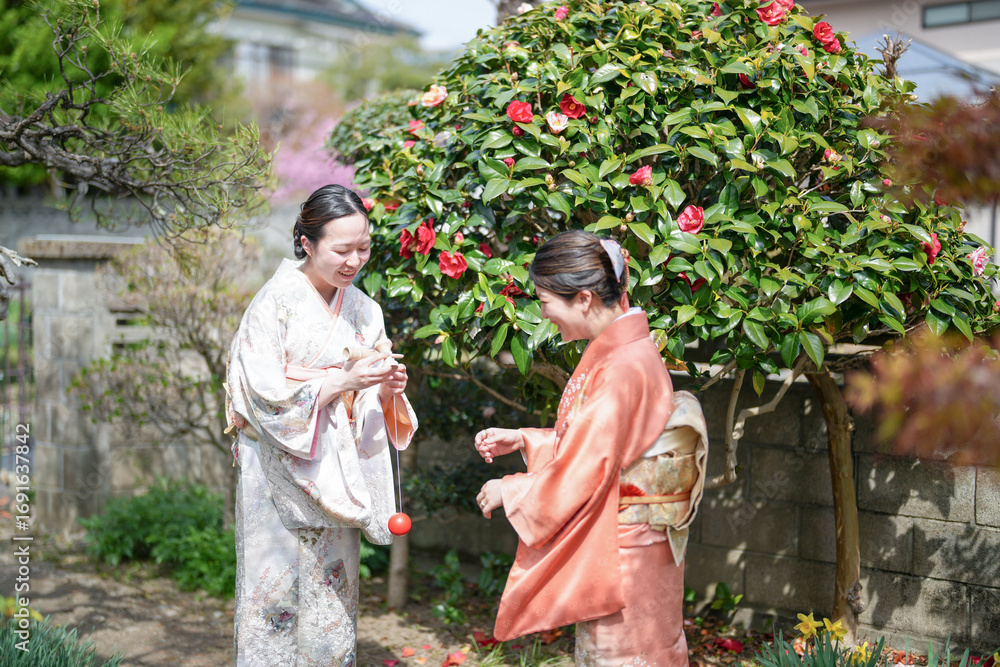 Two women in traditional Japanese clothing are standing in front of a tree. One of them is holding a red ball