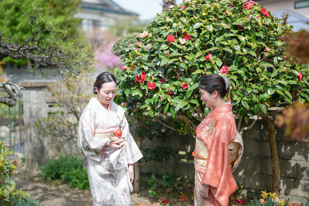 Two women in kimonos are standing in front of a tree. One of them is holding a flower