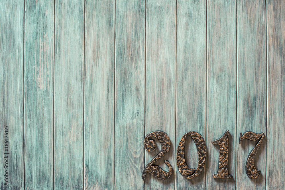 Metal forged 2017 date on vintage old grunge mint green painted wooden wall planks texture background. Retro instagram style filtered photo