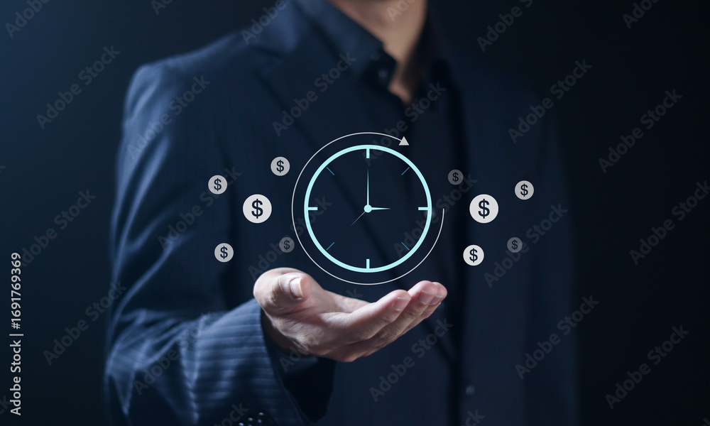 Time is money. Long financial investment, future income and money profit benefit. Businessman holding time and money icons on virtual screen.