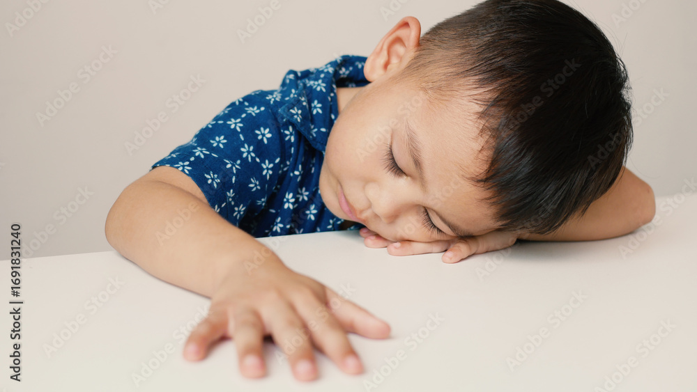 Asian little boy sleeping on a white table, accidentally sleeping without thinking much, on a white background, innocent little boy