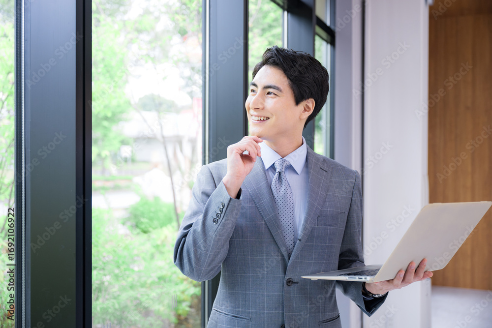 A man in a suit holding a laptop Consultant, recruitment, and other career change imagery Smiling, thinking, reflecting