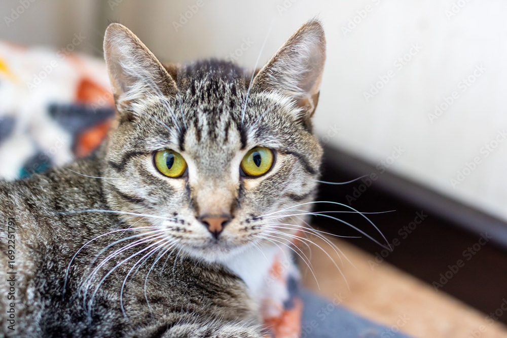 Closeup of a cat with striking yellow eyes gazing at the camera