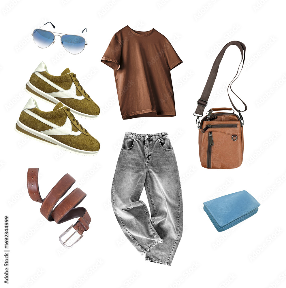 Men's clothes set isolated on white, trendy stylish look.Male clothing collection, fashion outfit.Nobody.