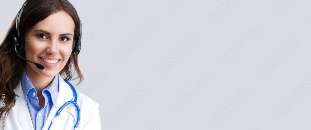 Portrait image - happy smile doctor woman, physician therapist wear white coat phone headset with microphone isolated against gray grey background. Medical medic care call center service assistant