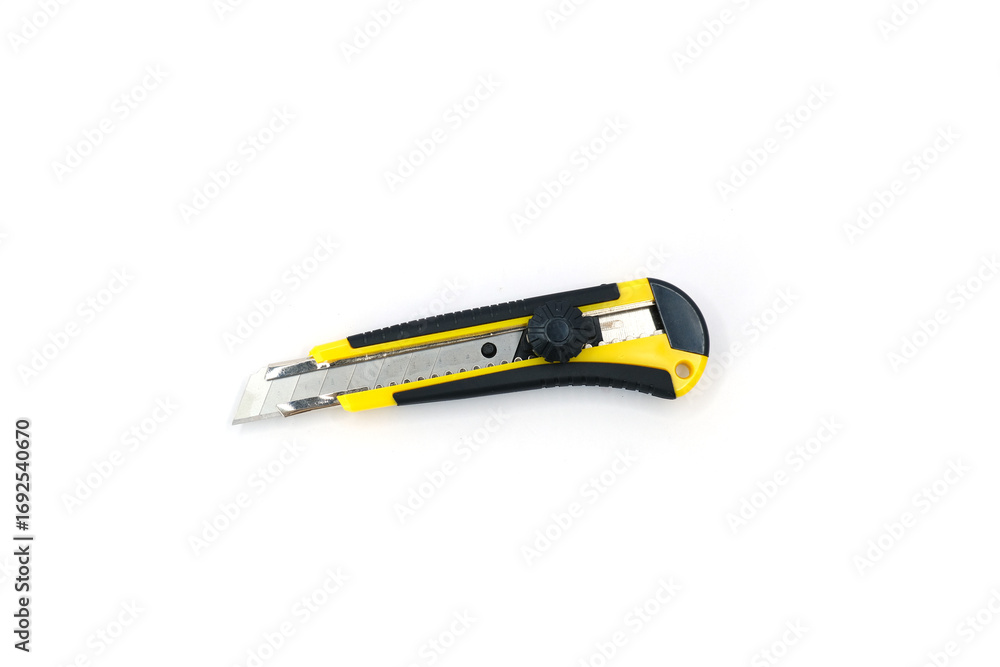 Yellow and black utility cutter knife with retractable blade, photographed on a clean white background