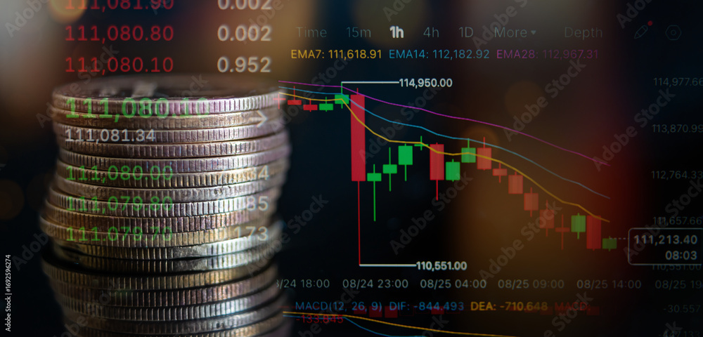 Cryptocurrency market analysis featuring digital coins and trading charts in a financial setting
