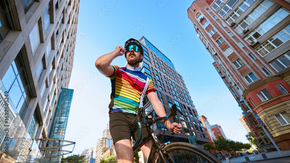 Cyclist in colorful jersey adjusting glasses with bicycle near modern buildings. Concept of urban lifestyle, sports activity, professional cycling, and emotional confidence.