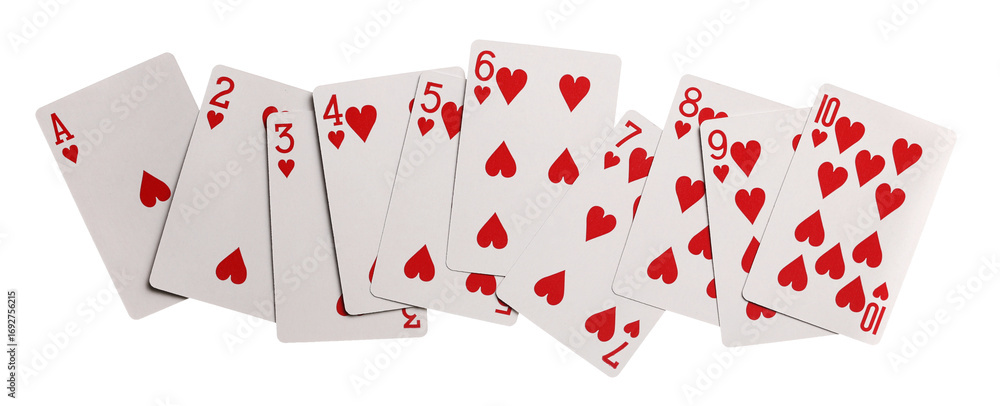 Playing cards for poker and gambling, series of hearts isolated on white background, clipping path