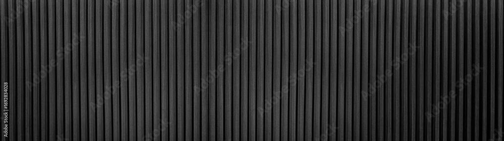 Dark Black Wood slat background use as banner in panorama long view. Grey wooden wall texture , seamless pattern. Modern ribbed wooden texture for design and decoration.